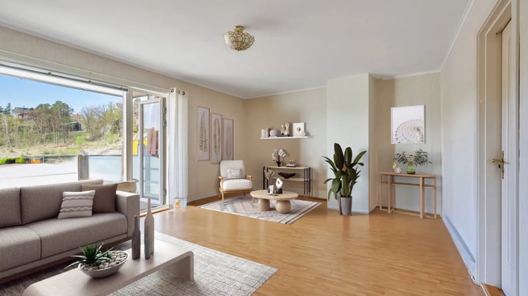 Vi gjenskaper møblene som allerede er i huset. Er boligen tom, møblerer vi virtuelt for å vise boligen fra sin beste side.